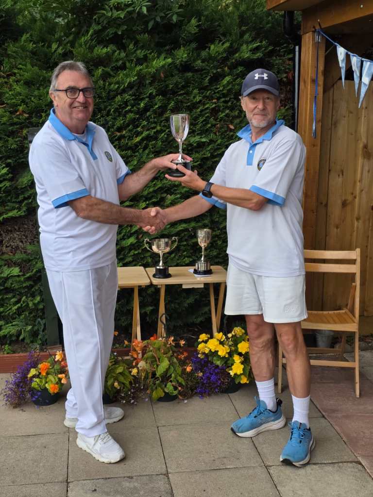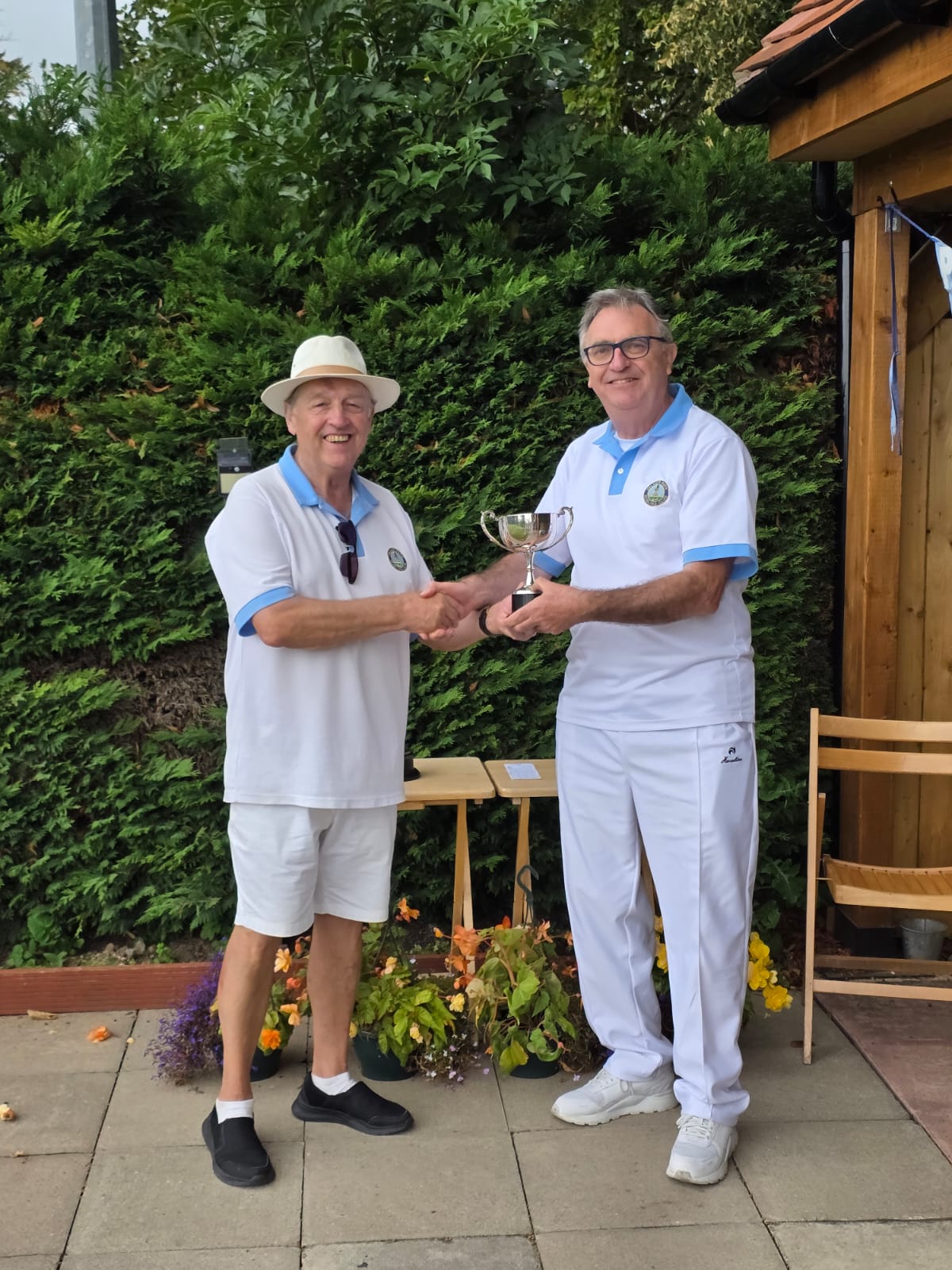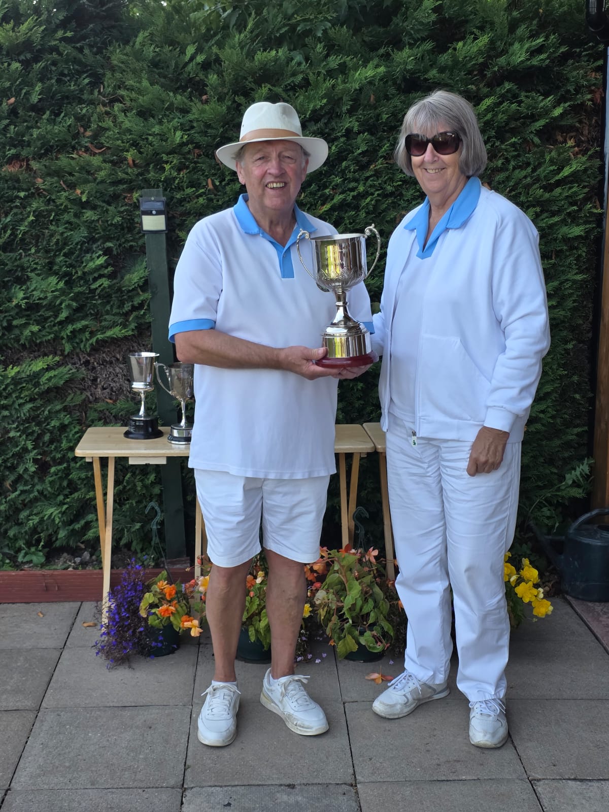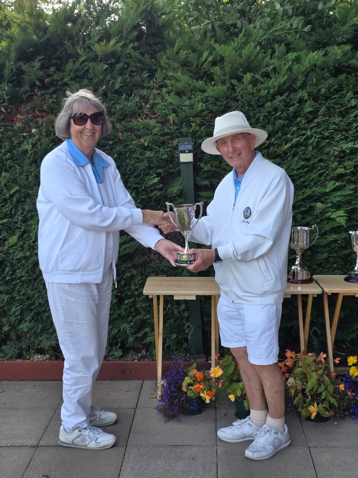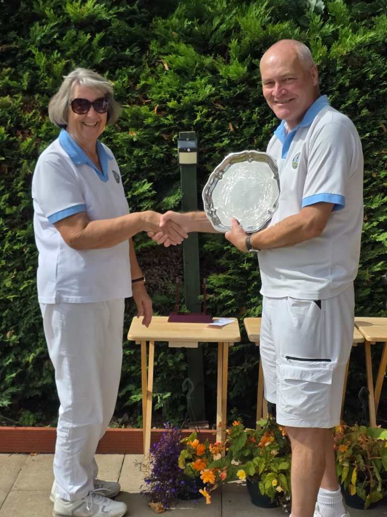 Winners Margaret Gearing and Jack Hannah receiving the trophy from Kevin Terry.