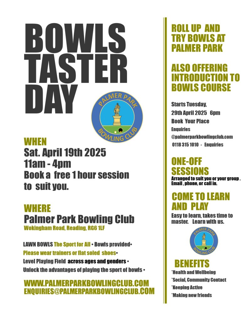 Updates 2025 Bowls Taster Day is on Saturday 19th April between 11:00 and 16:00. If you are able to help at any time during the day please let the organisers know. Like Loading...